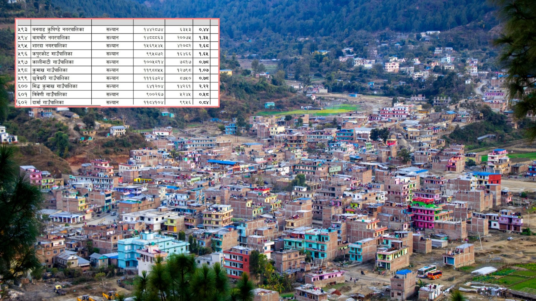 - बागचौर नगरपालिका: १ अर्ब ४८ करोड ८८ लाख ८३ हजार लेखापरीक्षण, २ करोड ७५ हजार (१.३५%) बेरुजु