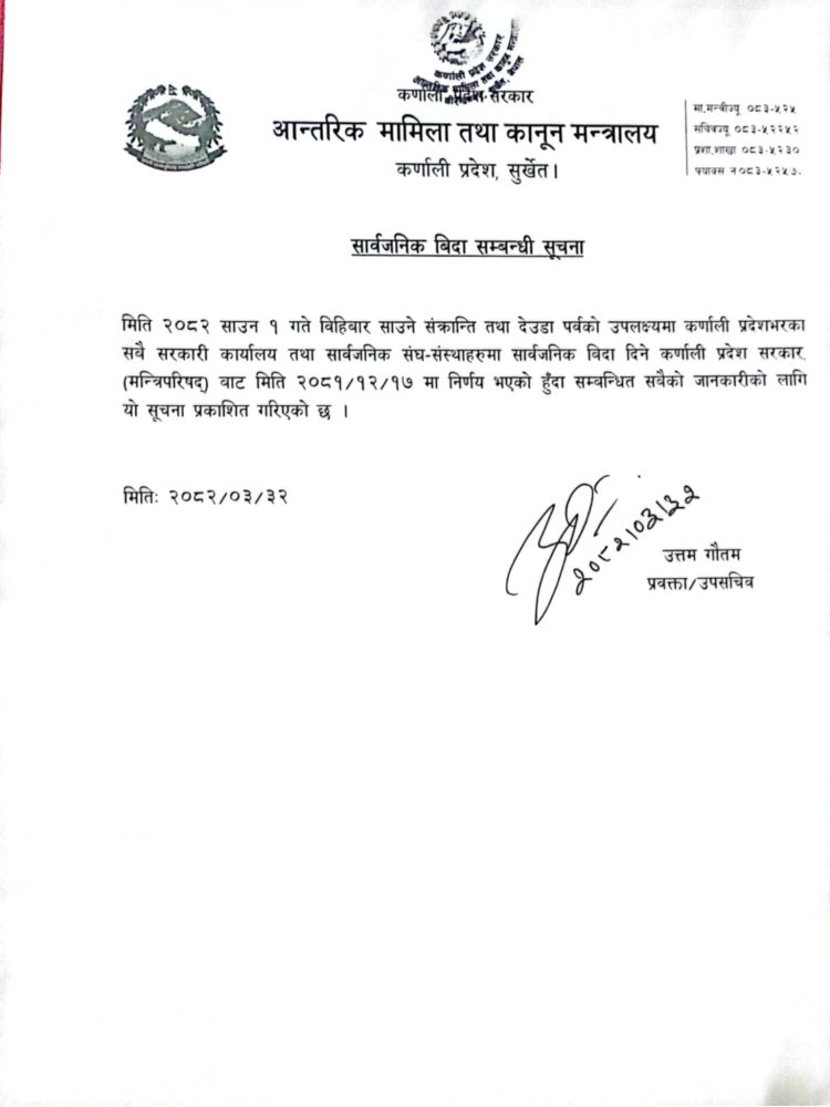 सुर्खेत । कर्णाली प्रदेश सरकारले साउन १ गतेको संक्रान्ति तथा देउडा पर्वका अवसरमा प्रदेशभर सार्वजनिक बिदा दिने निर्णय गरेको छ ।